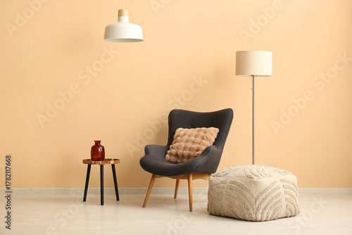 Stylish armchair with soft pouf and lamps near beige wall in modern room