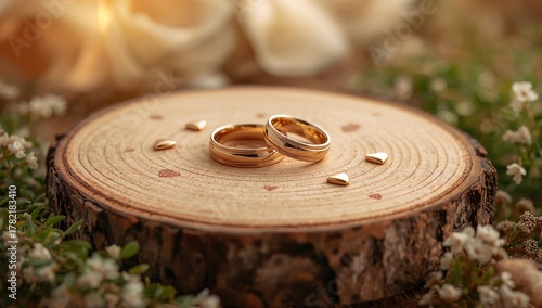 Two golden bands resting on a wooden stand adorned with small hearts symbolizing affection