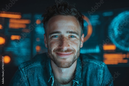 Embodying style and confidence: the charisma of the modern man. Data visualization. The idealistic persona: an elegant portrait in denim's simplicity. Interactive charts. Virtual interface.