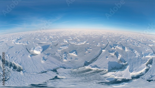 Aerial view of the frozen White Sea, showcasing massive ice floes covering the ocean, erosion risk