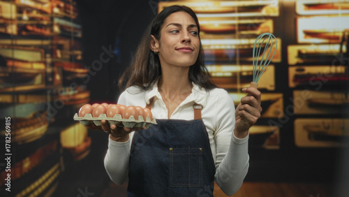 Woman holding carton of eggs and whisk in museum building display, posing with slight smile while presenting ingredients; home cooking pride.