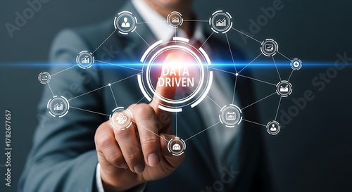 Businessman touching a futuristic interface with the words data driven in the center, symbolizing data analysis and decision making