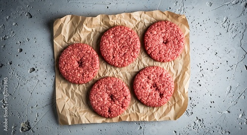Five Raw Ground Beef Patties on Parchment Paper Ready for Grilling.