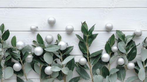 Elegant arrangement of green leaves and silver ornaments on a white wooden surface for festive decorations and holiday celebrations