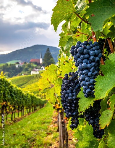 Close-up of ripe grapes in vineyard row, distant village, green leaves, cloudy sky