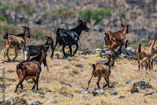 Feral Goats (The goat or domestic goat (Capra hircus) is a species of goat-antelope that is mostly kept as livestock) . near Kaupo. Hawaii Route 31 ( Pi'ilani Highway ), Maui, Hawaii.