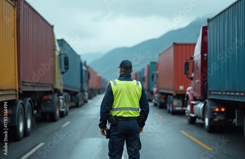Customs officer on highway border checkpoint watches long line of waiting cargo trucks. Uniformed patrol agent controls commercial vehicle traffic, freight transport. Lorries with containers await