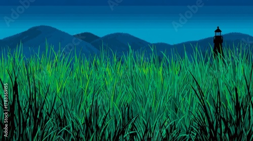 A bright horizon features rolling green hills accompanied by a white structure