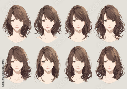 Zbiór różnorodnych fryzur damskich, prezentujący eleganckie cięcia i stylizacje włosów średniej długości, idealne do inspiracji.