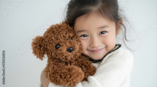ぬいぐるみを抱いた満面の笑顔の女の子の写真