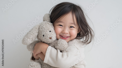 ぬいぐるみを抱いた満面の笑顔の女の子の写真