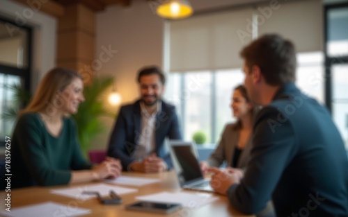 A cozy office setting with blurred employees discussing ideas. High quality