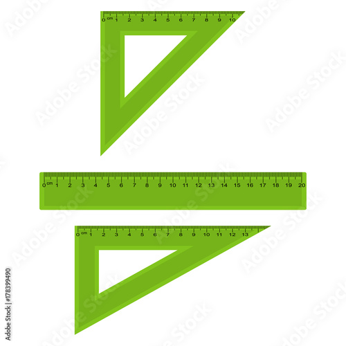 Plastic measuring and triangle rulers in centimeters and millimeter. Vector illustration.