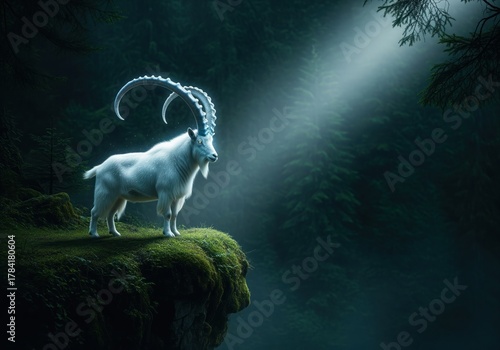 Ghostly white goat with massive glowing horns standing on a dark mossy precipice.
