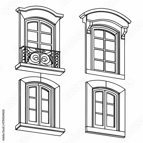Four detailed architectural window outlines with balcony