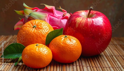 Assorted fresh fruits including tangerines, red apple, and pink dragon fruit on bamboo mat for editorial food photography natural decor and poetic abundance-themed visuals