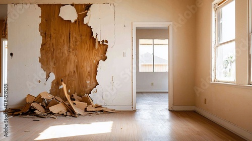 Interior Demolition Stripped Wall Reveals Wood Sunlight on Hardwood Floor.