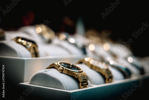 Montres de luxe en vitrine dans une bijouterie