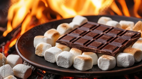 DIY s mores bar with marshmallows and chocolate over outdoor campfire, summertime desserts, fun gathering concept