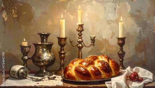 Braided loaf of bread on silver platter with lit candles, goblets, and grapes in classical still life setting for editorial culinary photography festive decor and poetic tradition-themed visuals