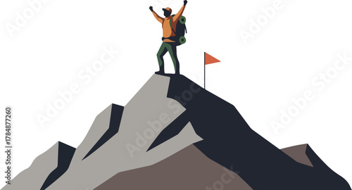 A person celebrates reaching the summit of a rocky mountain peak, with a red flag marking the achievement.
