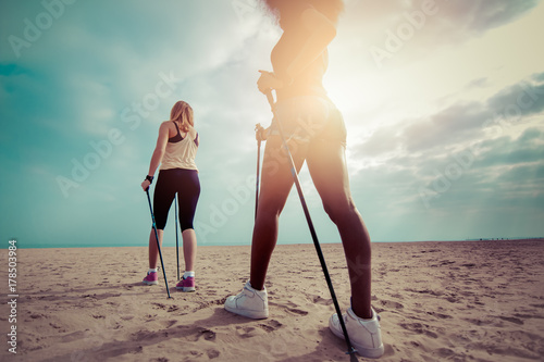 two girls nordic walking with sticks on beach. low angle back view. cyan to orange color sun flare effect