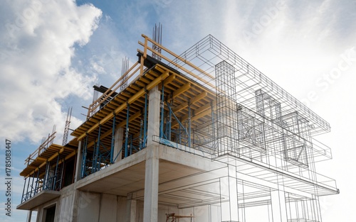 This image displays a concrete building under construction, with a transparent wireframe blueprint overlay revealing the intended structure.