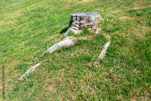 Photograph of an old sawn off dead wooden tree stump located in a grassy field in New South Wales, Australia.
