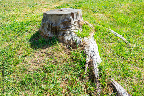 Photograph of an old sawn off dead wooden tree stump located in a grassy field in New South Wales, Australia.