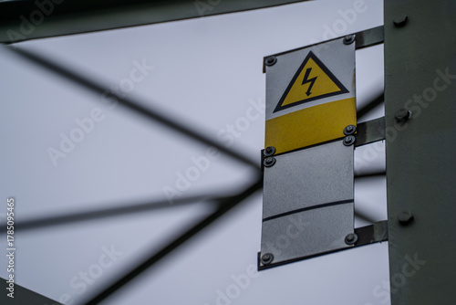 Znak ostrzegawczy wysokiego napięcia na metalowej konstrukcji – symbol zagrożenia prądem elektrycznym