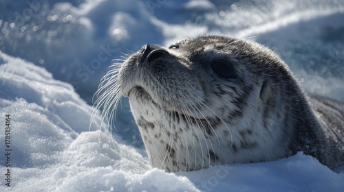 A seal is relaxing on a patch of ice, looking up with its whiskered face. The bright blue water surrounds the icy area, creating a serene and chilly atmosphere.