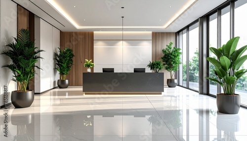 モダンオフィスの受付ロビー – 洗練された企業空間と清潔感のある内装