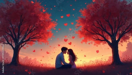 Young couple sits closely on green grass field under two red leaf trees. Hearts fall from starry evening sky at romantic sunset. Lovers gaze at with deep affection. Dreamy art shows true love story