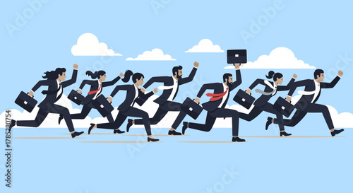 business people running in a race striving for success symbolizing competition and corporate ambition against a blue sky with clouds