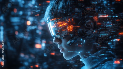 Futuristic Person Wearing VR Headset Immersed in Digital World