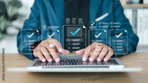 Businessman showing online document validation icon, quality assessment management With a checklist, business document evaluation process.