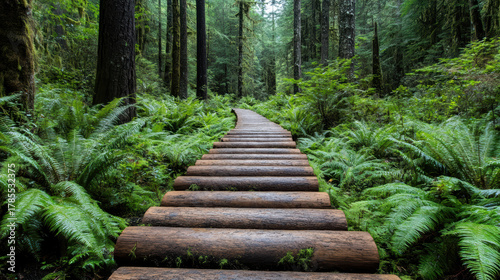 Quiet trail in temperate rainforest with lush ferns and wooden steps leading through tall trees, creating serene and peaceful atmosphere