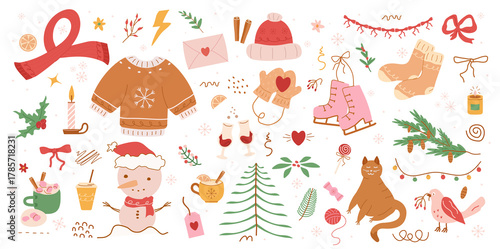 Retro vintage, concept winter, pattern, Fir tree, stars, dots, snow, line drawing. Holiday design elements are isolated on pink background. Simple shape conceptfor winter season cards, print