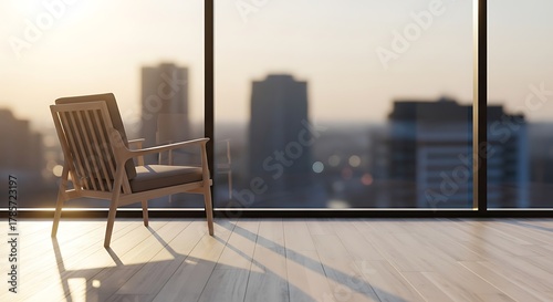 부드러운 햇살 아래 놓인 편안한 의자, 도시 배경으로 아늑한 분위기 연출