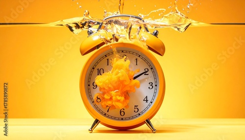 Orange analog alarm clock with liquid splash effect on white background for editorial time photography energetic decor and poetic urgency-themed visuals