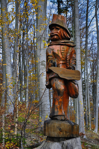 Misternie rzeźbiona drewniana statua przedstawiająca surową postać w kapeluszu i z brodą stoi na solidnej kłodzie w jesiennym lesie.