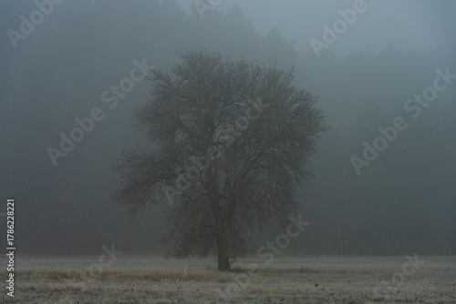 Listopadowy poranek. Płaski teren, łąka pokryta suchą trawą. Nad ziemią unosi się gęsta mgła. We mgle widać niewyraźnie samotne, bezlistne drzewo.