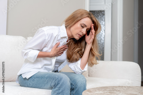 Mature woman experiencing severe chest pain and difficulty breathing at home