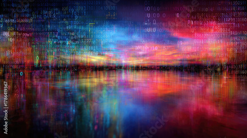 Surreal digital landscape blending paint strokes and binary code, AI-generated visual poetry, futuristic art concept