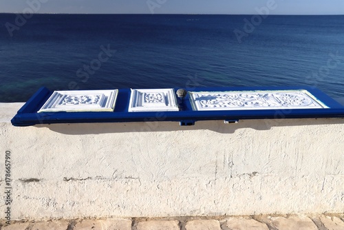 bardzo ciekawe zdjęcie, na murku leżą drzwi a w tle morska , błękitna przestrzeń.