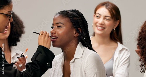 Backstage, getting ready and makeup with women in studio for fashion showcase preparation. Behind the scenes, beauty or cosmetics with cosmetologist and talent on white background for styling
