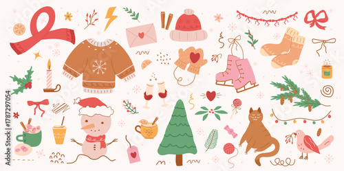 Retro vintage, concept winter, pattern, Fir tree, stars, dots, snow, line drawing. Holiday design elements are isolated on pink background. Simple conceptfor winter season card, for party, print