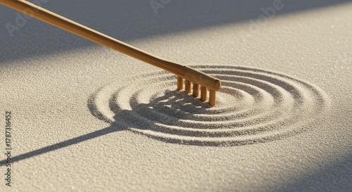 A rake meticulously creating concentric circles in light beige sand
