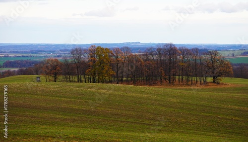 Mała wyspa drzew pośrodku rozległej, zielonej łąki w Czechach. Naturalna, spokojna kompozycja z wyraźnym kontrastem między gęstą grupą drzew a otwartą przestrzenią pola.