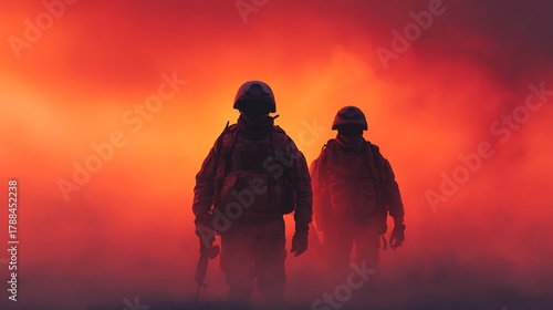 Two silhouetted soldiers stand against a dramatic, fiery backdrop, symbolizing courage and resilience in a hostile environment.